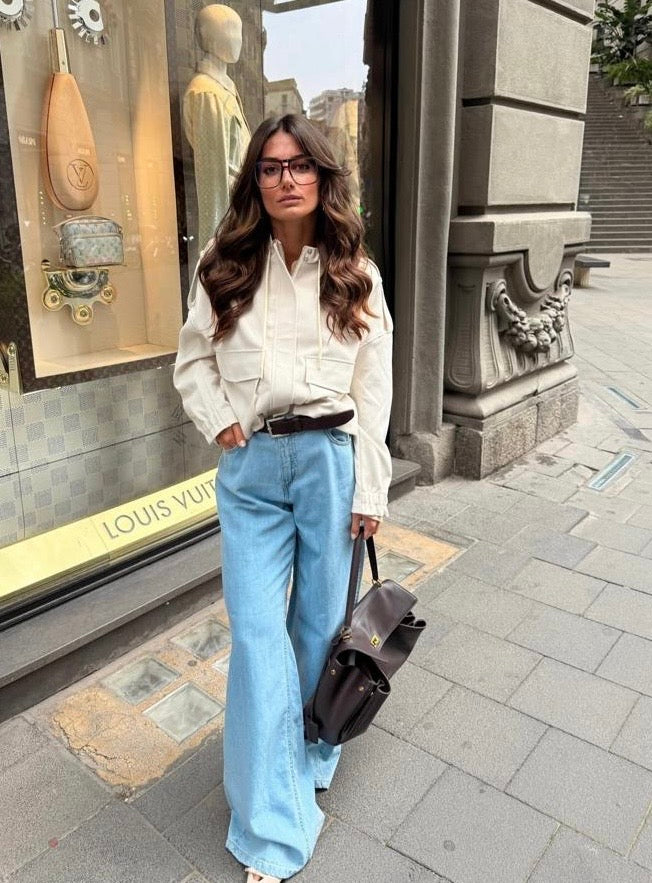 Bomber da donna color bianco panna con zip frontale e maxi tasche applicate. Dal design minimal e moderno, è un capo versatile ideale per la mezza stagione. Perfetto per outfit casual chic, si abbina facilmente a jeans, pantaloni o gonne, rendendo ogni look sofisticato ma comodo.