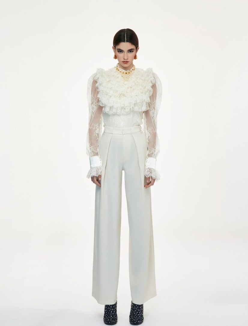 Camicia in pizzo color burro firmata Odi Odi, caratterizzata da romantici volant sul colletto e sul petto, maniche lunghe trasparenti e polsini in raso. Un capo raffinato e femminile, ideale per completare look eleganti da giorno o da sera. Perfetta con pantaloni a vita alta o gonne midi per uno stile sofisticato e senza tempo.