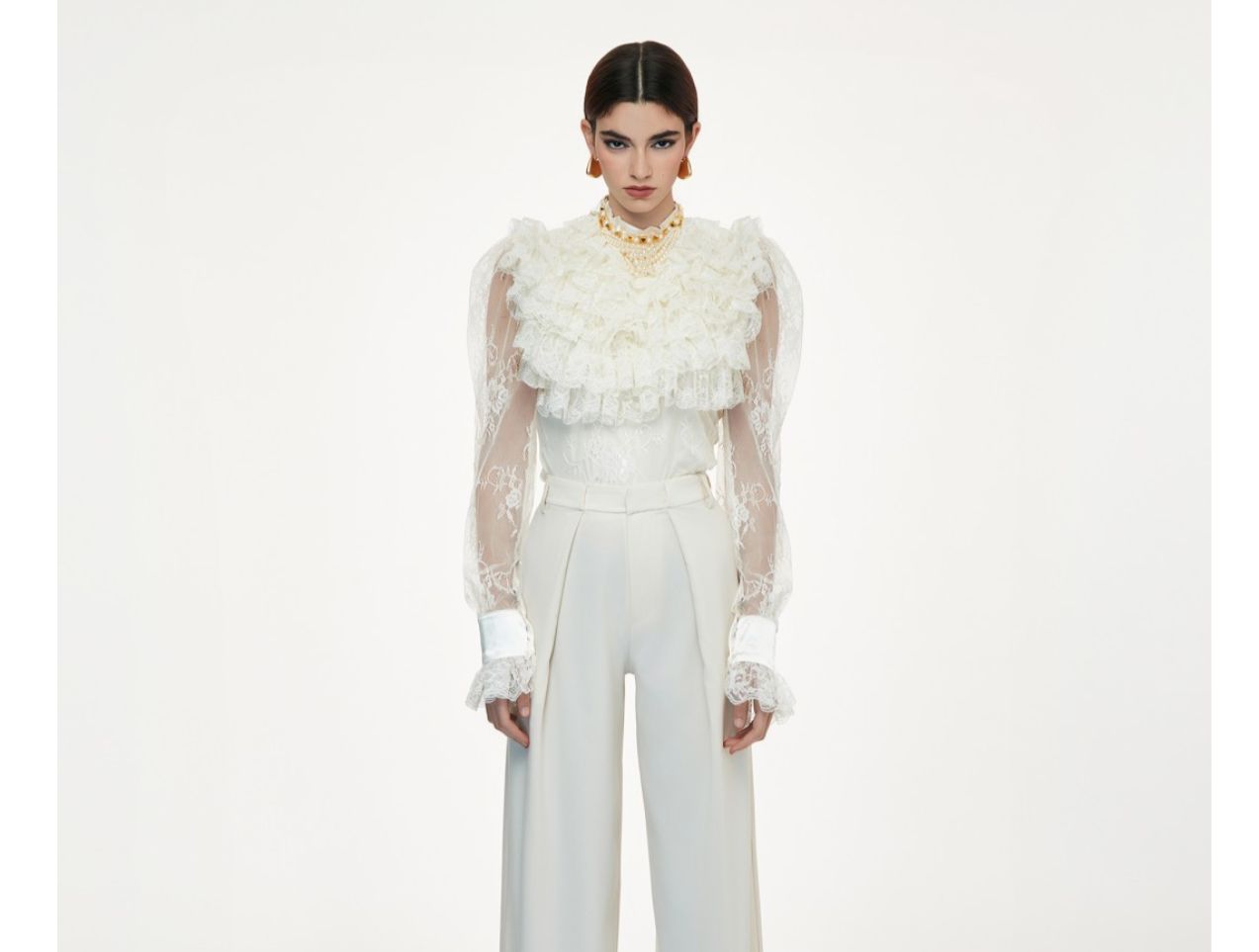 Camicia in pizzo color burro con volant e maniche trasparenti – eleganza romantica | Odi Odi